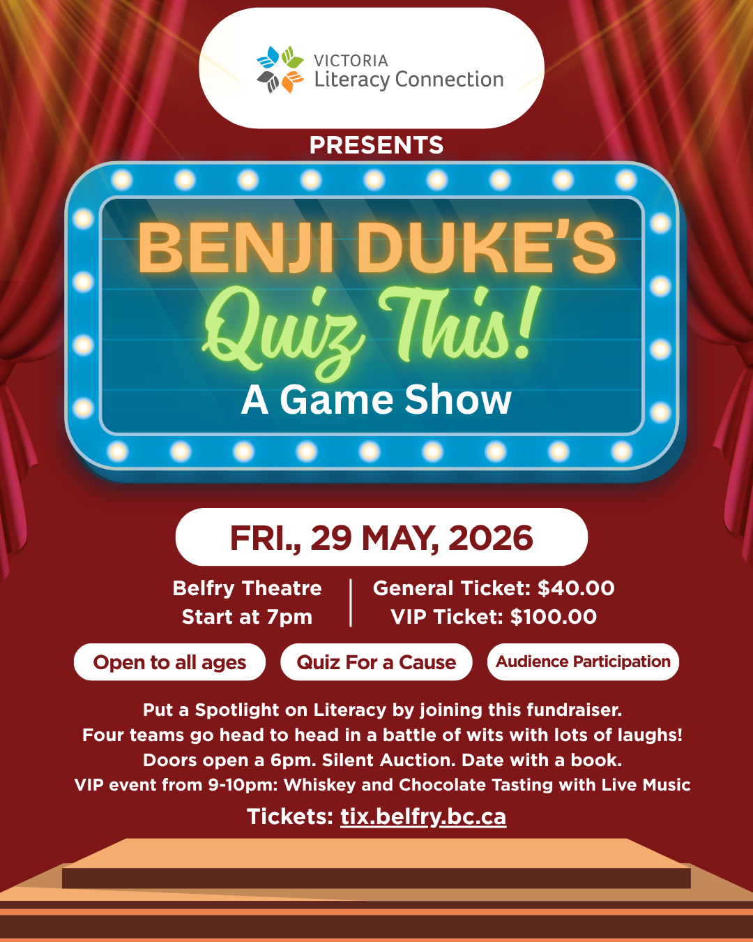 VLC is doing it again! Last year’s fundraiser was so much fun, that we are doing a repeat with Benji Duke’s Quiz This! game show at the Belfry Theatre on Friday, May 29th. Local philanthropist, Tony Joe, will be the MC.